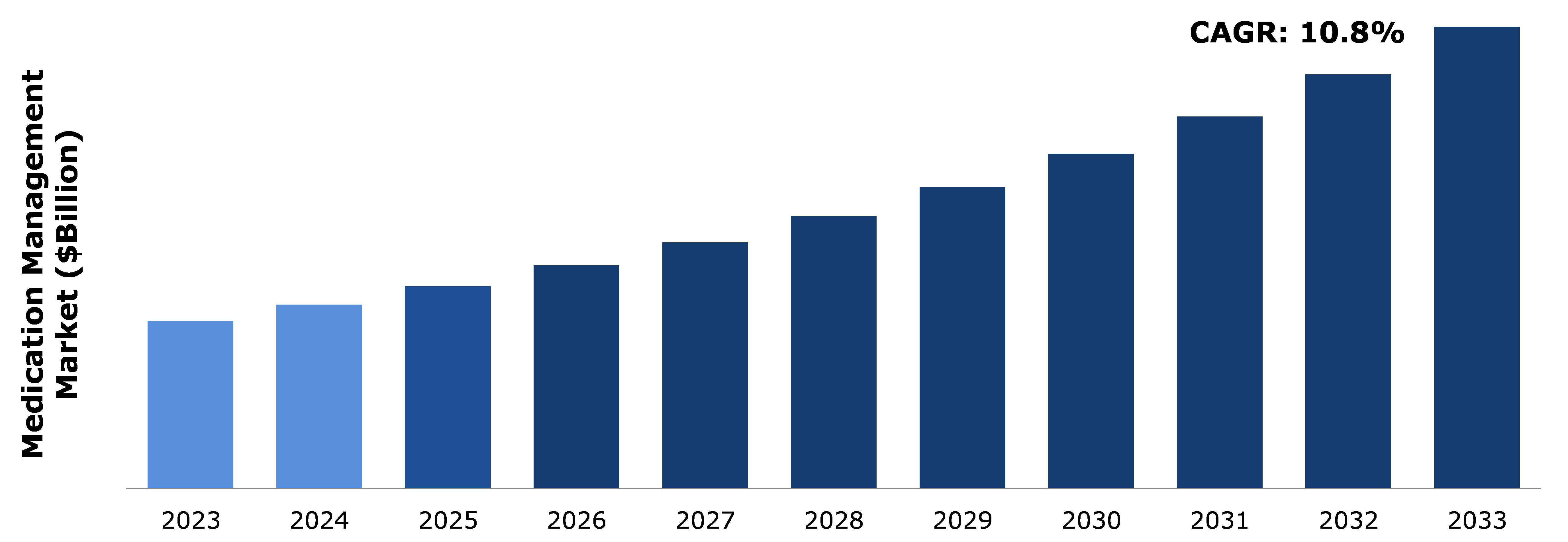 The medication management market was valued at $3.1 billion in 2023 and is estimated to reach $8.6 billion by 2033, exhibiting a CAGR of 10.8% from 2024 to 2033.
