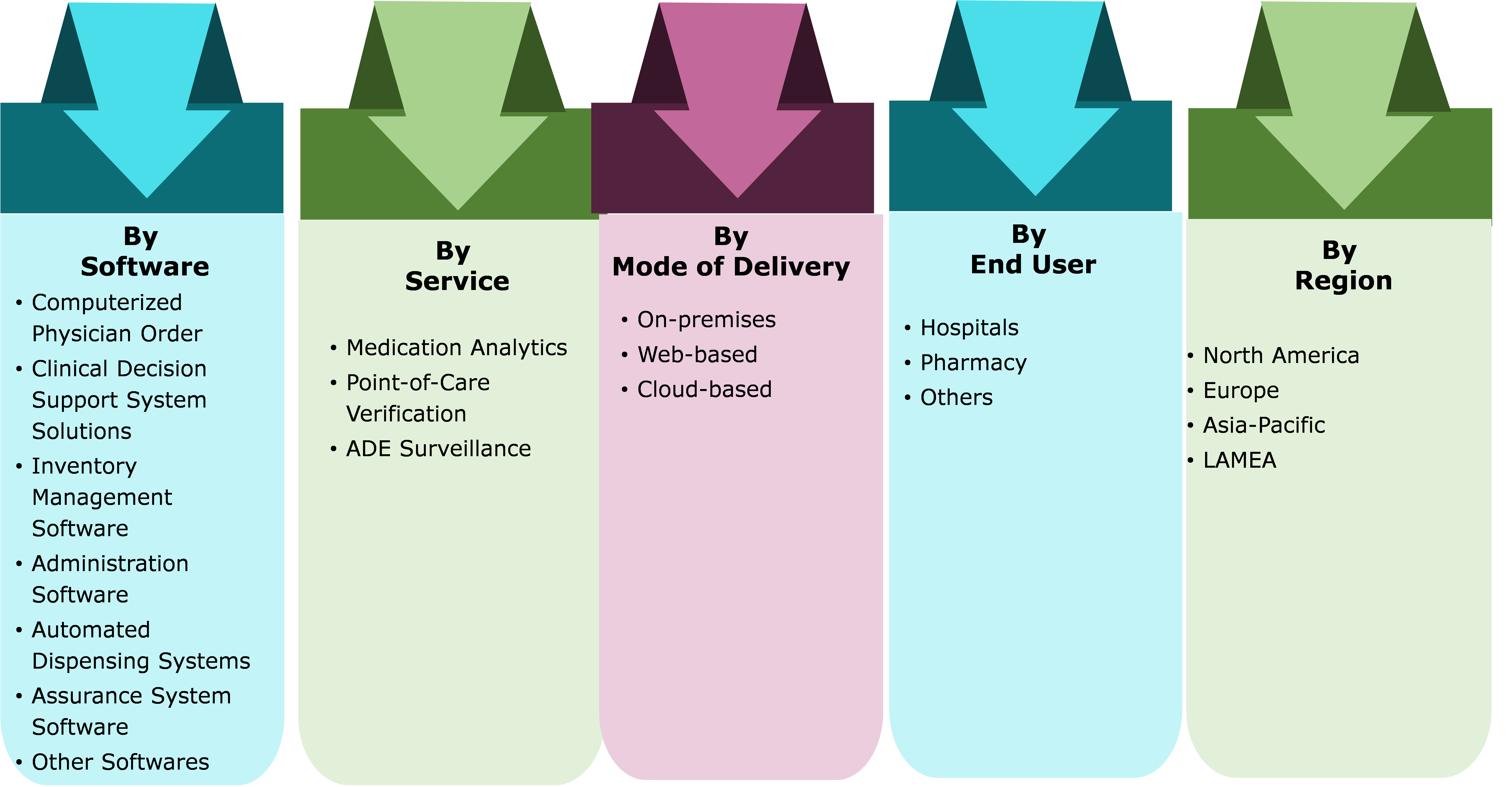 The medication management market is segmented into software, service, mode of delivery, end user, and region. On the basis of software, the market is divided into computerized physician order, clinical decision support system solutions, inventory management software, administration software, automated dispensing systems, assurance system software, and other software. On the basis of service, the market is divided into medication analytics, point-of-care verification, and ADE surveillance. On the basis of mode of delivery, the market is divided into on-premises, web-based, and cloud-based. On the basis of end user, the market is divided into hospitals, pharmacy, and others. Region wise, the market is analyzed across North America, Europe, Asia-Pacific, and LAMEA.