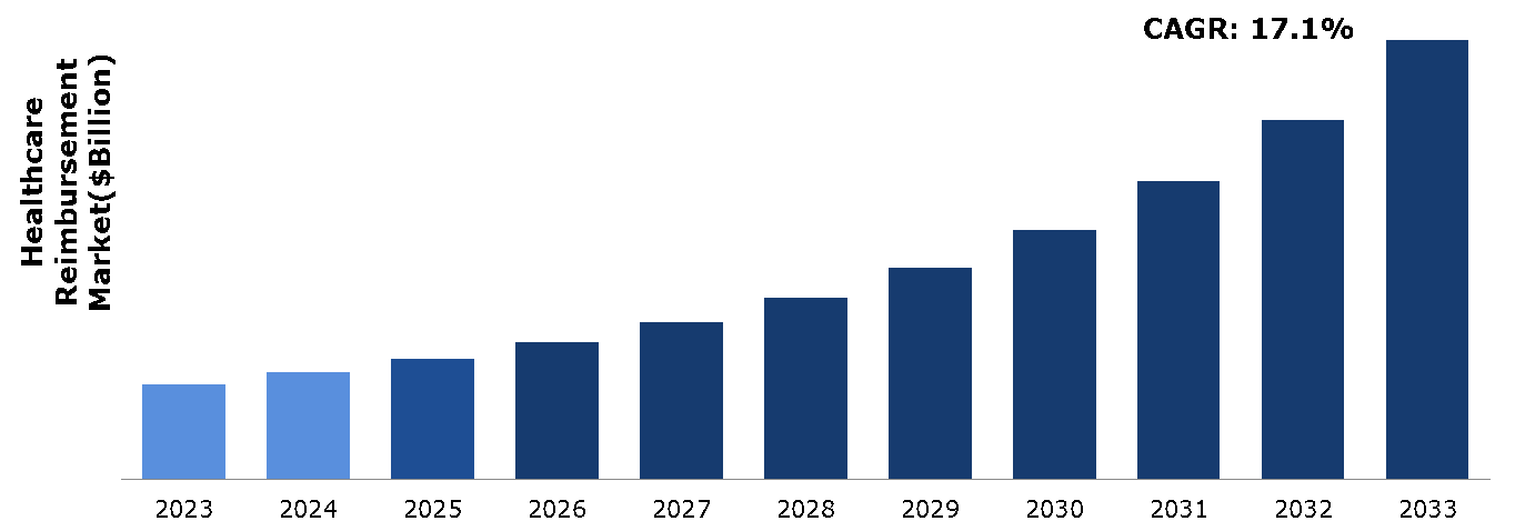 The healthcare reimbursement market was valued at $8.99 billion in 2023 and is estimated to reach $41.49 billion by 2033, exhibiting a CAGR of 17.1% from 2024 to 2033.