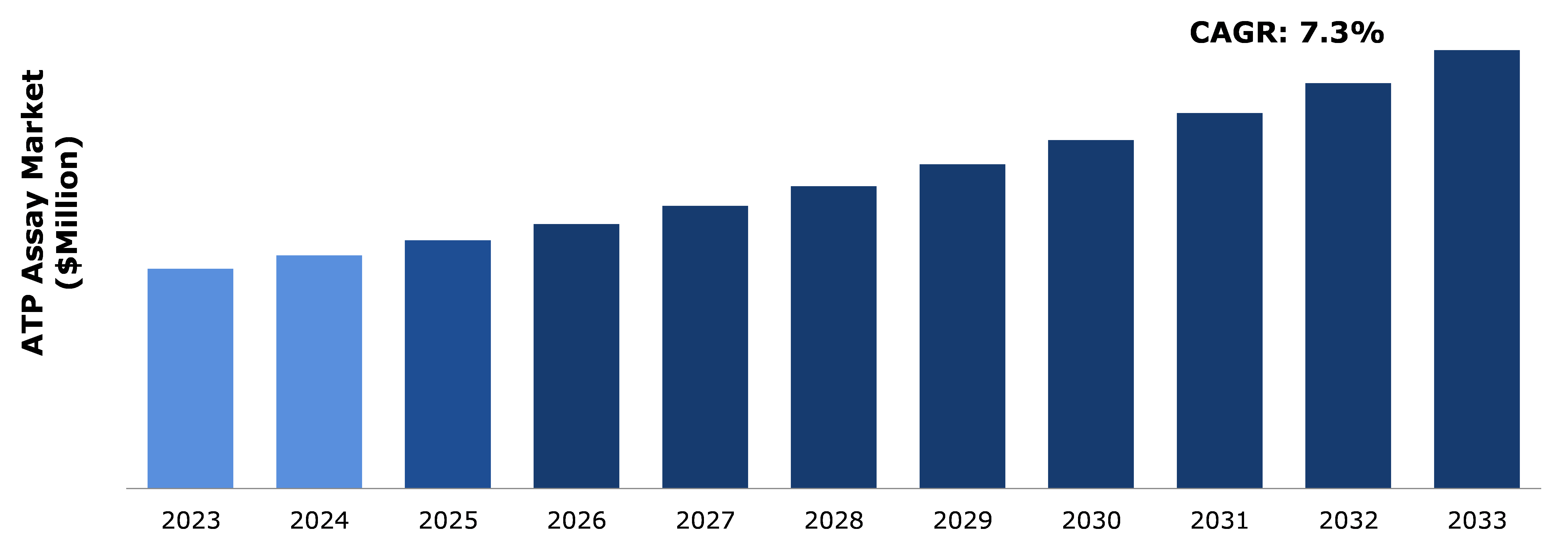 The ATP assay market was valued at $316.5 million in 2023 and is estimated to reach $631.8 million by 2033, exhibiting a CAGR of 7.3% from 2024 to 2033.