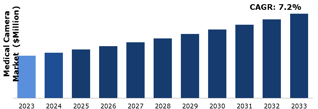 The medical camera market was valued at $3,036.29 million in 2023 and is estimated to reach $6,059.85 million by 2033 exhibiting a CAGR of 7.2% from 2024 to 2033