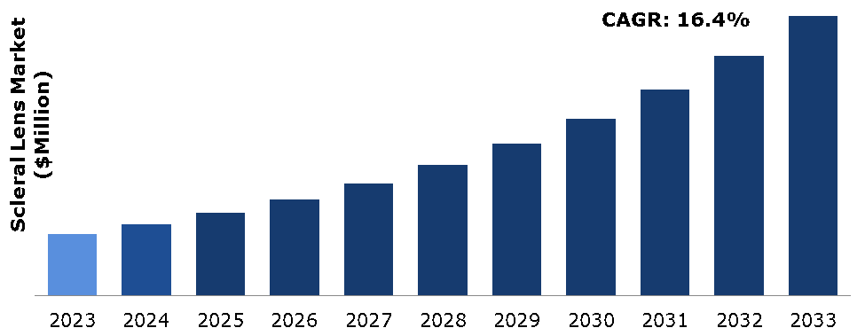The scleral lens market was valued at $334.22 million in 2023 and is estimated to reach $1,519.47 million by 2033 exhibiting a CAGR of 16.4% from 2024 to 2033