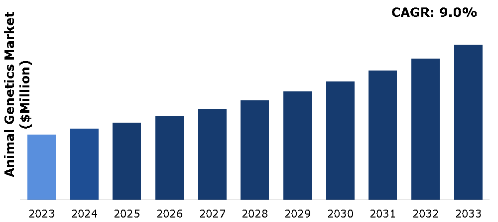 The animal genetics market was valued at $8,236.20 million in 2023 and is estimated to reach $19,482.52 million by 2033 exhibiting a CAGR of 9.0% from 2024 to 2033
