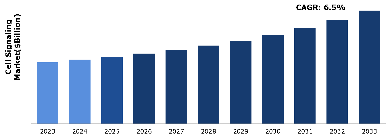 The cell signaling market was valued at $4.5 billion in 2023 and is estimated to reach $8.3 billion by 2033, exhibiting a CAGR of 6.5% from 2024 to 2033.