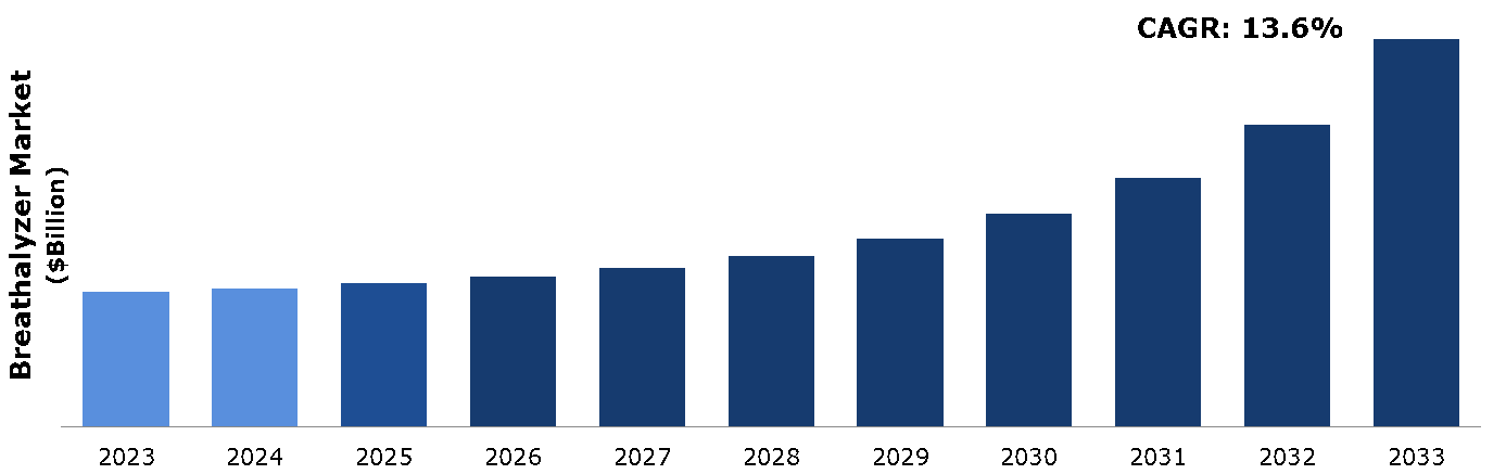 The breathalyzer market was valued at $2.94 billion in 2023 and is estimated to reach $9.61 billion by 2033, exhibiting a CAGR of 13.6% from 2024 to 2033.