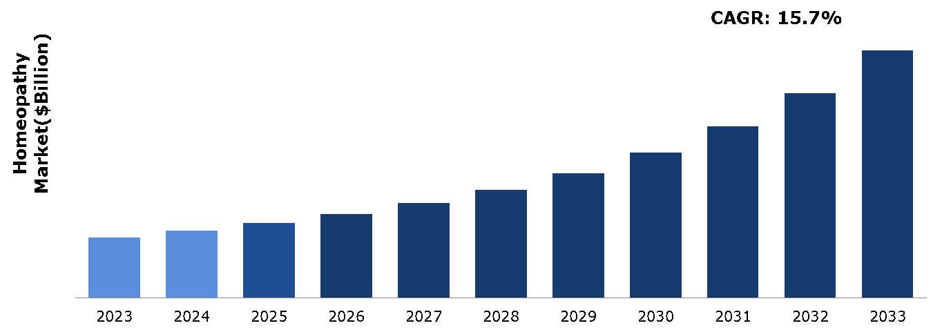 The homeopathy market was valued at $5.10 billion in 2023 and is estimated to reach $20.87 billion by 2033, exhibiting a CAGR of 15.7% from 2024 to 2033.