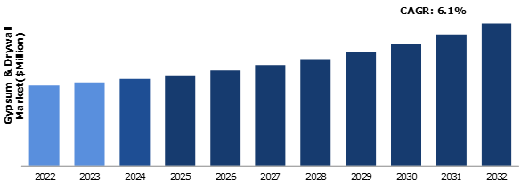 The global gypsum & drywall market size was $29,290.5 million in 2022 and is predicted to grow with a CAGR of 6.1%, by generating a revenue of $51,910.7 million by 2032.
